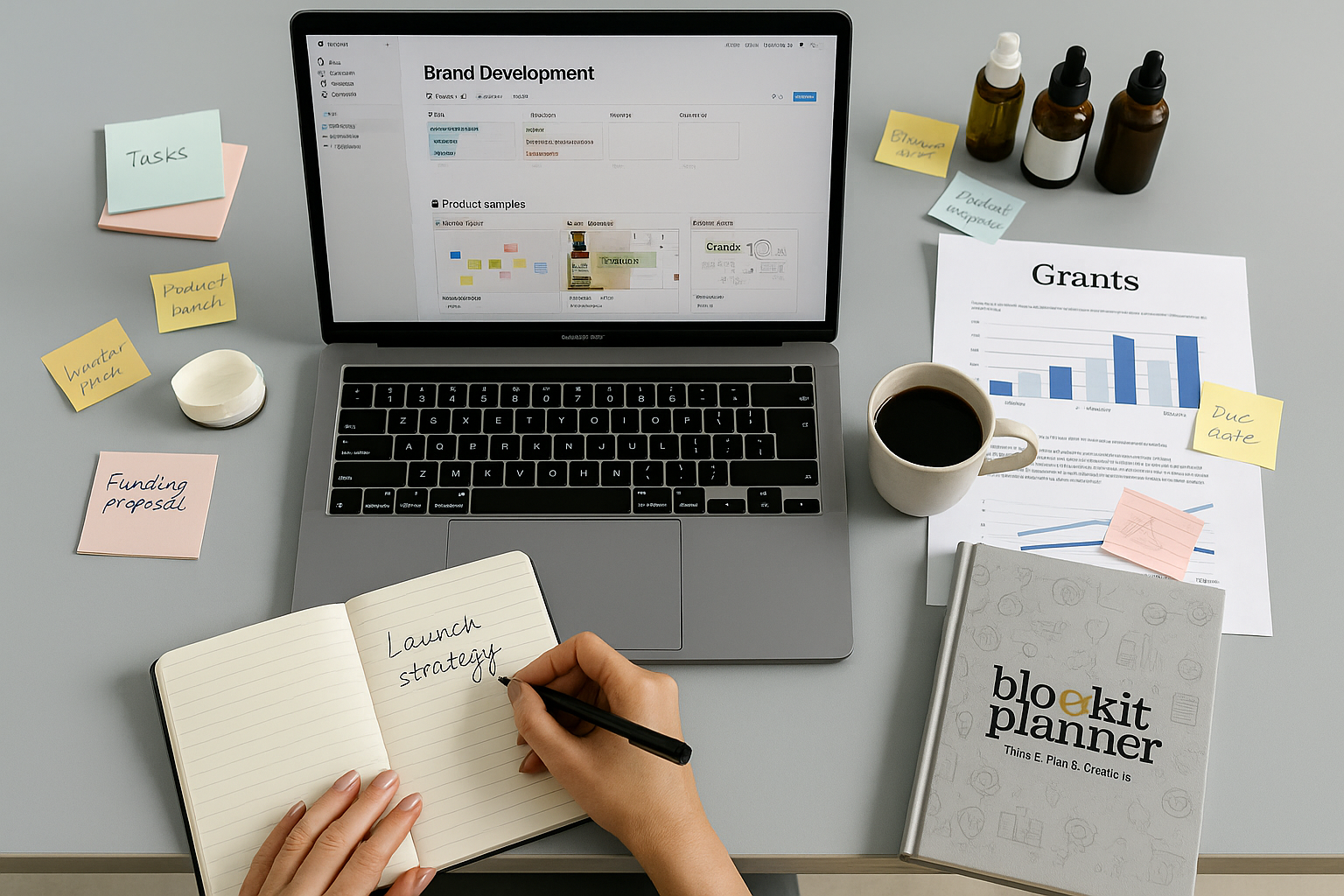 A desk full of planning tools — Notion page open, sticky notes, coffee, journal, product samples, grants printout. Maybe your hands in frame, mid-process.